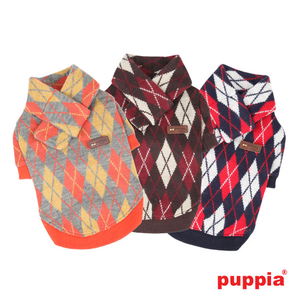 LINEAGE – warm Moda Puppia argyle patterned sweater with ribbed collar, sleeves and hem, for maximum comfort. Sweater and scarf sold together. It has a luxurious golden emblem. Made of 85% acrylic and 15% wool. Ideal for cold days, stylish and cute, this fashionable top will look fabulous worn by your dog!