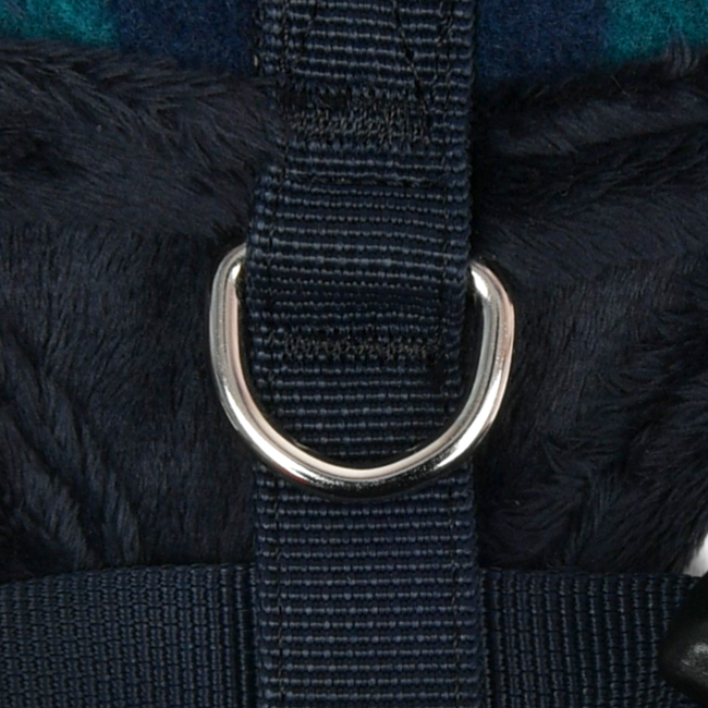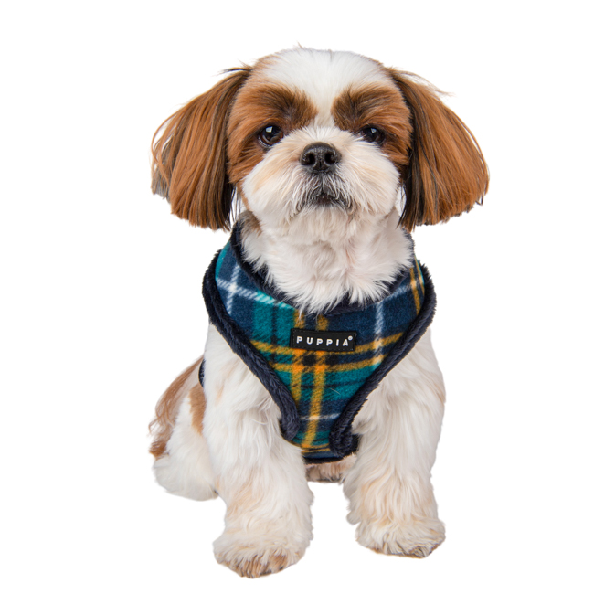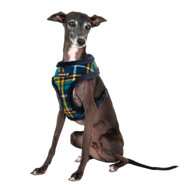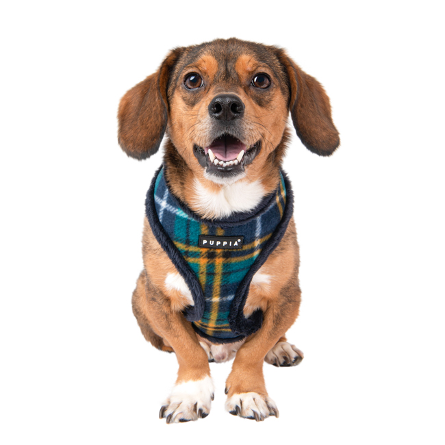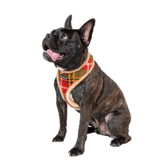 Safe and fashionable Model A harness with checkered pattern, adjustable chest strap and SMART tag.