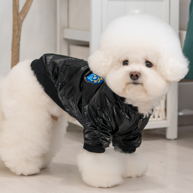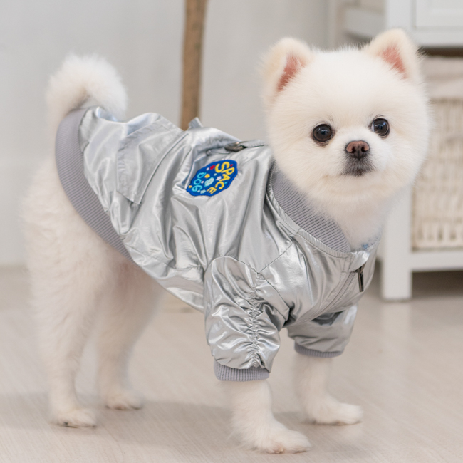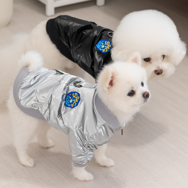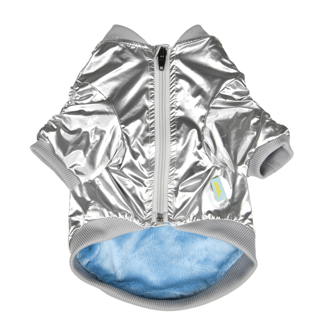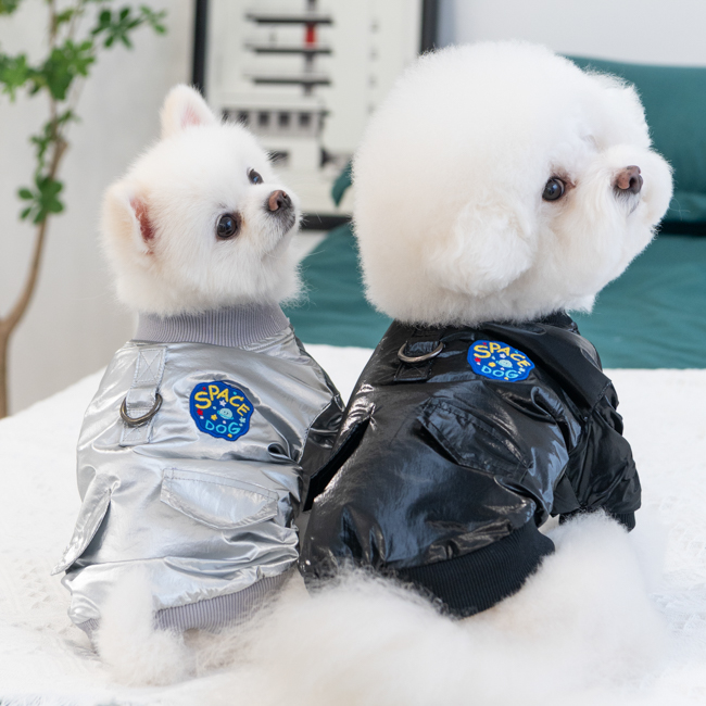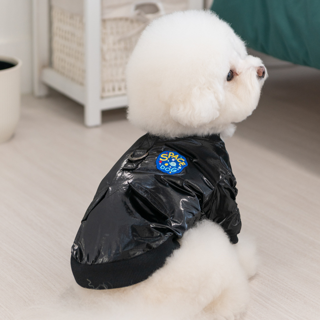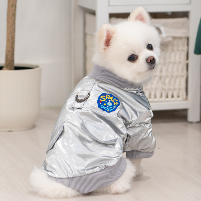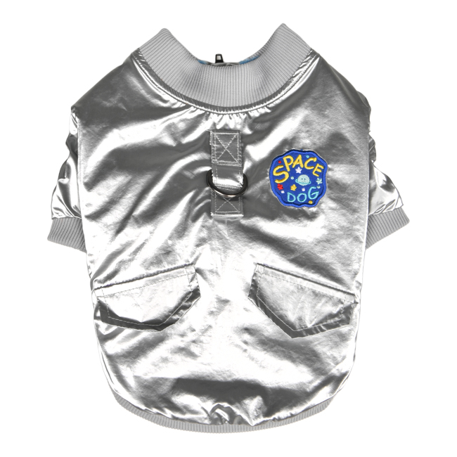 Made from glossy polyester fabric. Features a space-themed appliqué embroidery on the upper right back. Includes a D-ring on the back for attaching a leash and pocket accents. Lined with a contrasting colored fleece for added warmth.
