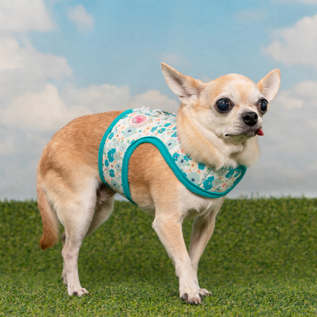 Pettorina modello J sicura e alla moda , motivo a cuori e tinta unita, fibbia e chiusura a strappo