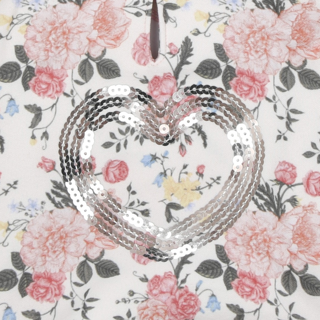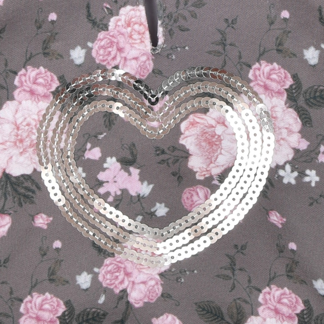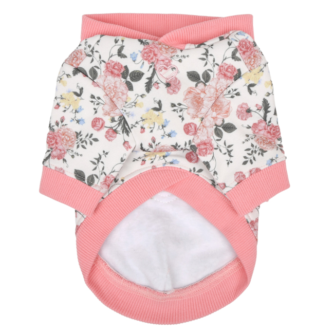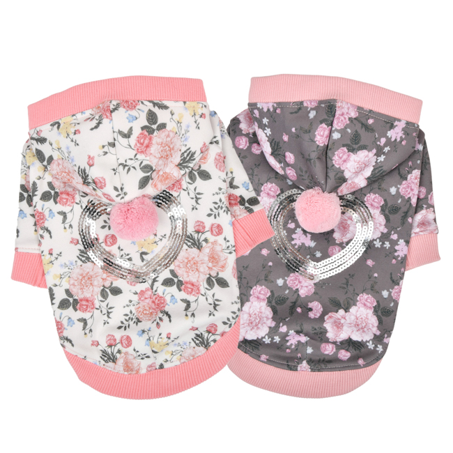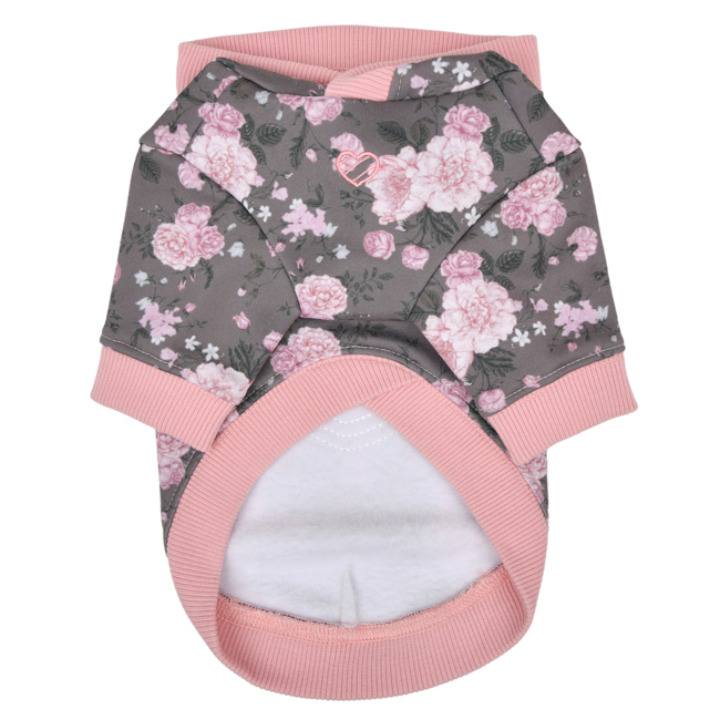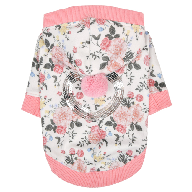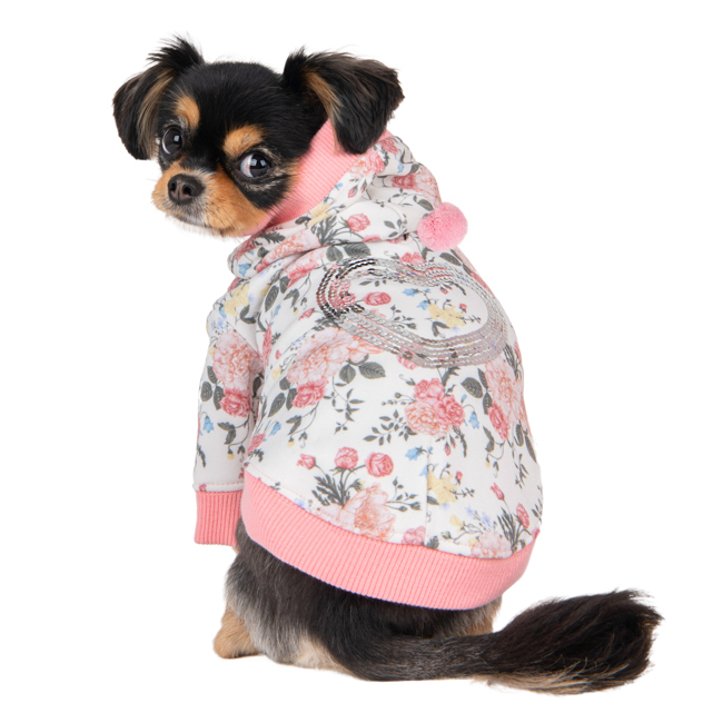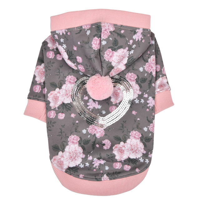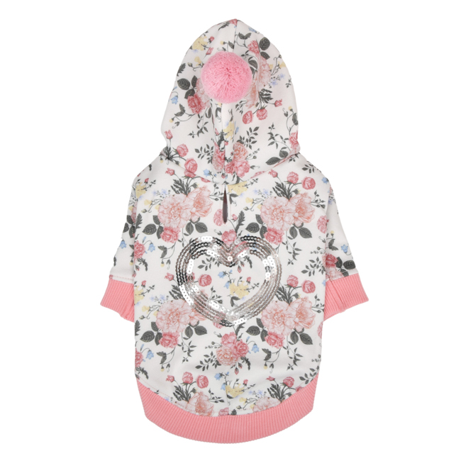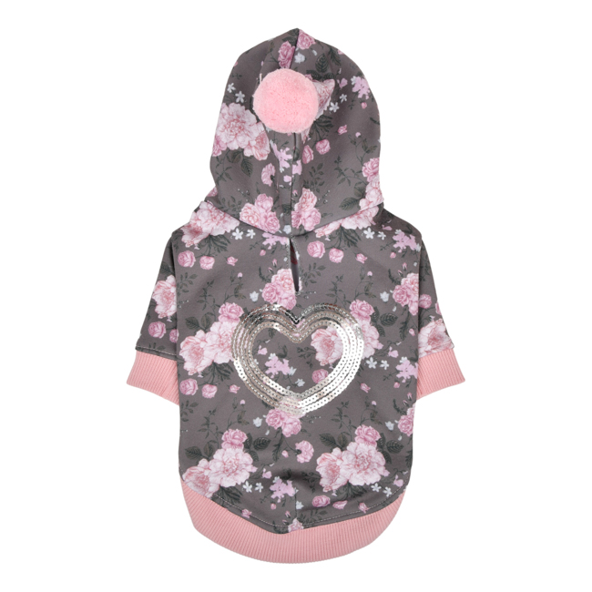 Felpa con cappuccio con pon pon, Motivo floreale stampato e tinta unita, Cuore con paillettes sul dorso, Con foro per uscita guinzaglio