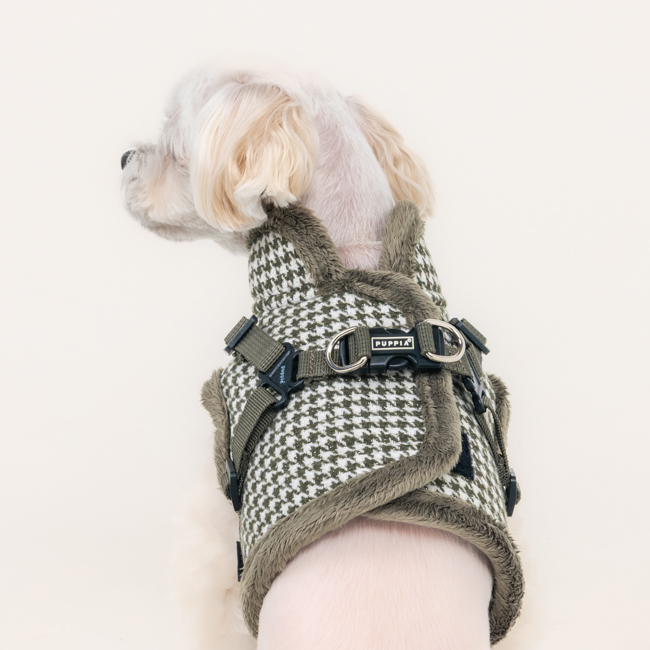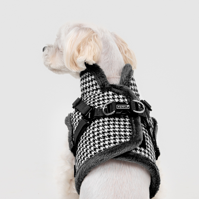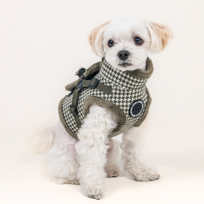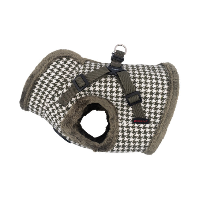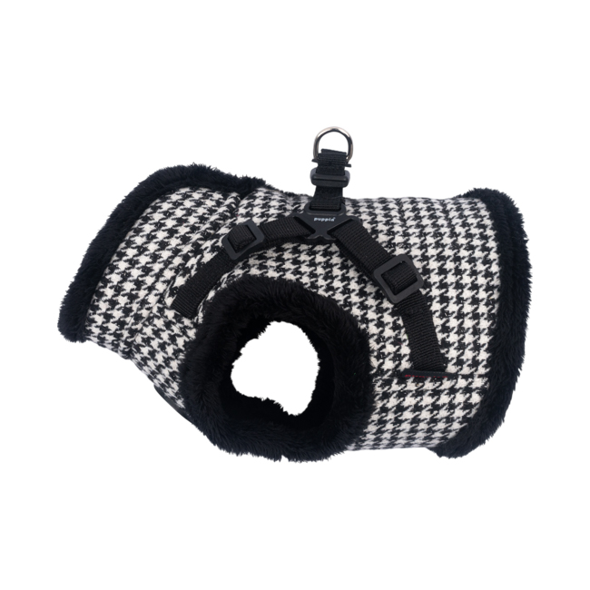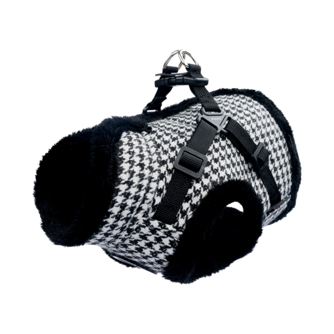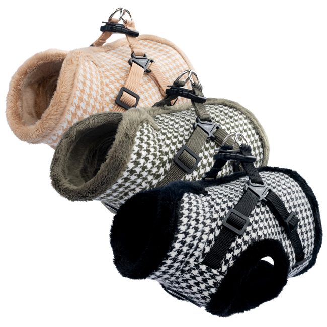 Pettorina invernale sicura e alla moda a gilet modello V, motivo pied de poule e tinta unita, Fibbia e chiusura a strappo