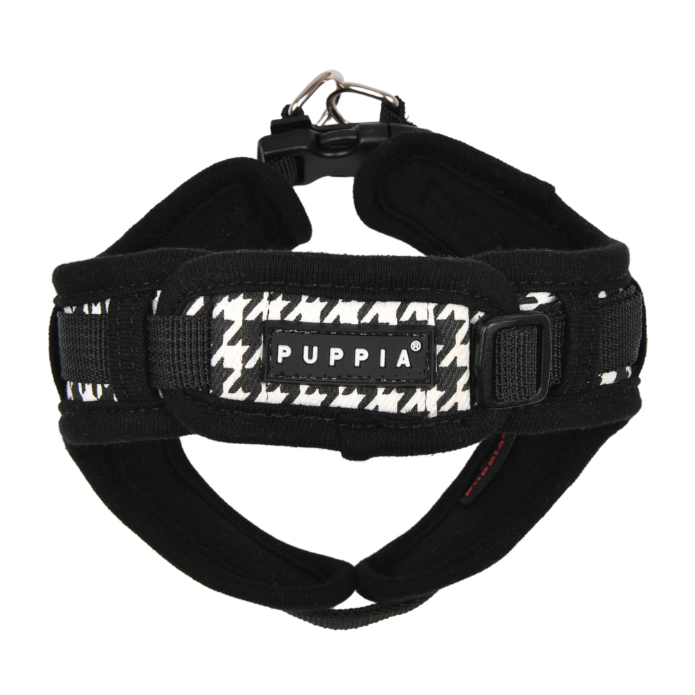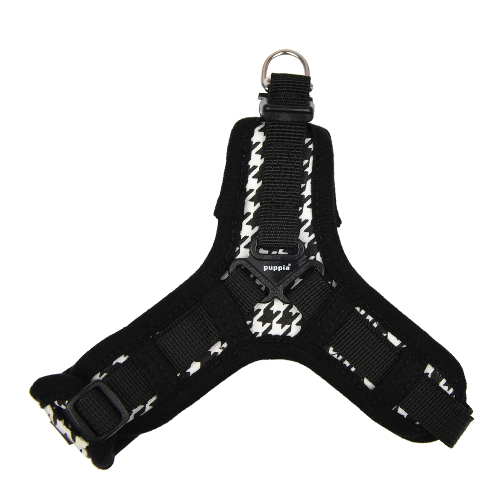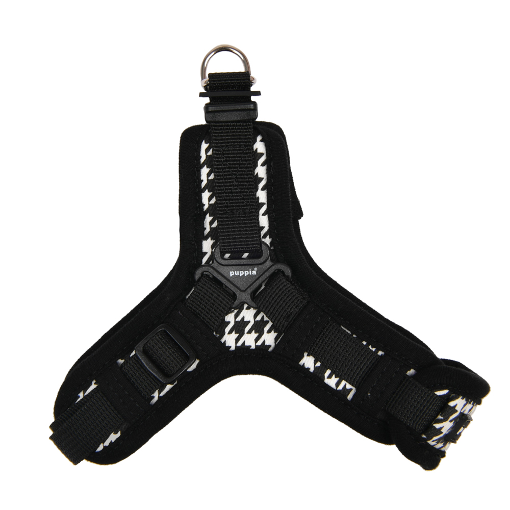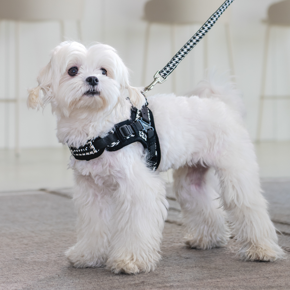 Pettorina modello X sicura e alla moda con motivo pied de poule, collo e cintura toracica regolabili e con targhetta SMART.