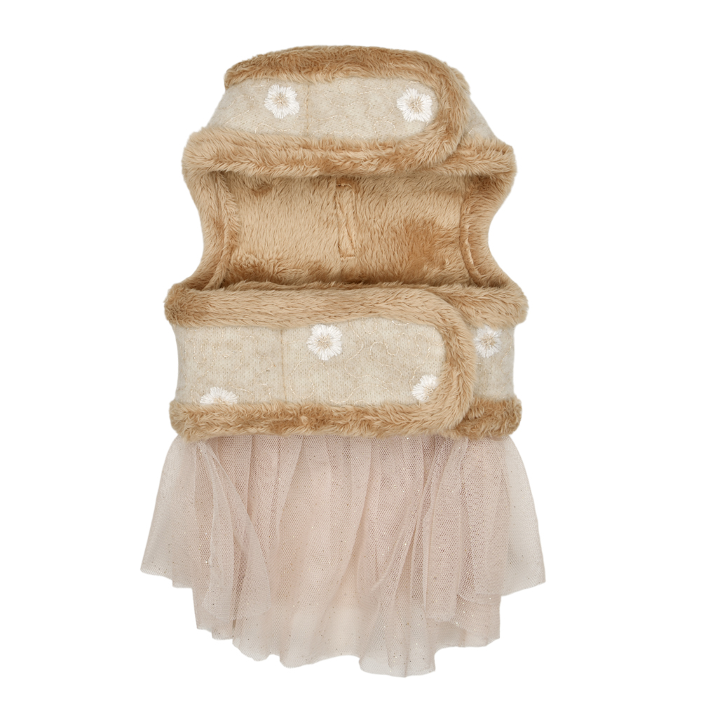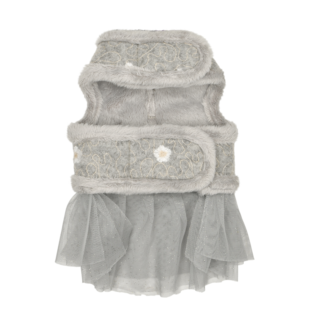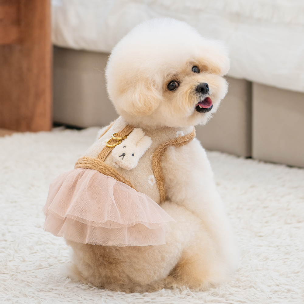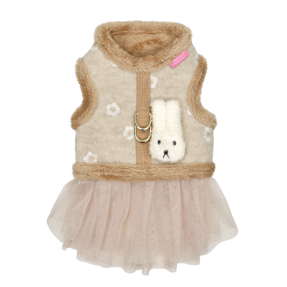 Pettorina abitino modello D sicura e alla moda, motivo floreale e tinta unita, chiusure a strappo su collo e petto, decorata con simpatico coniglietto di peluche sul dorso