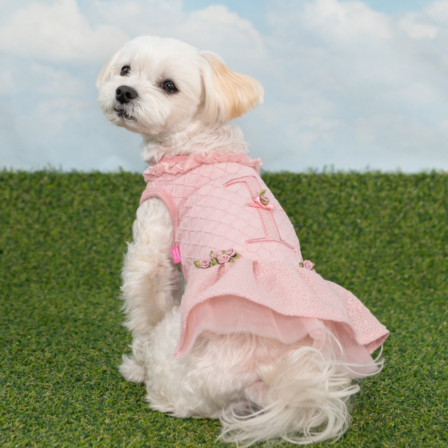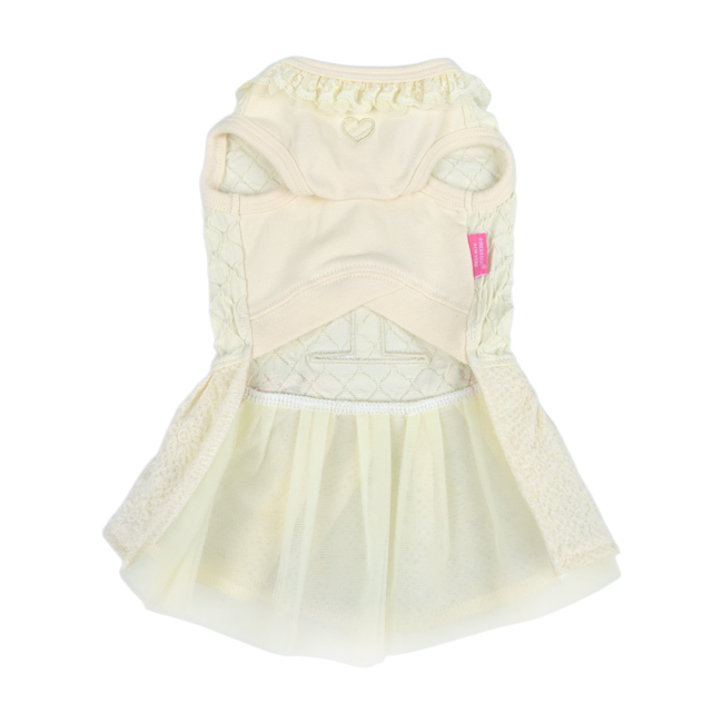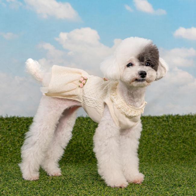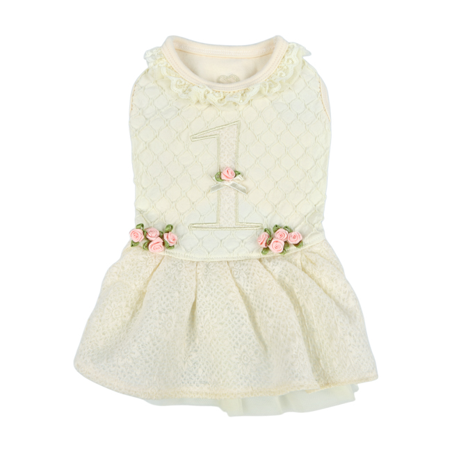 Abito intero, motivo a rombi e pizzo, decorato con fiori e corona sul dorso