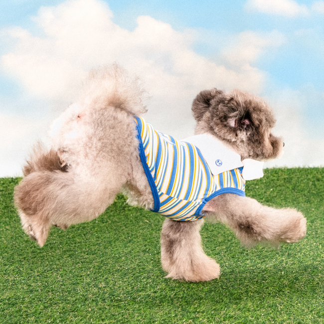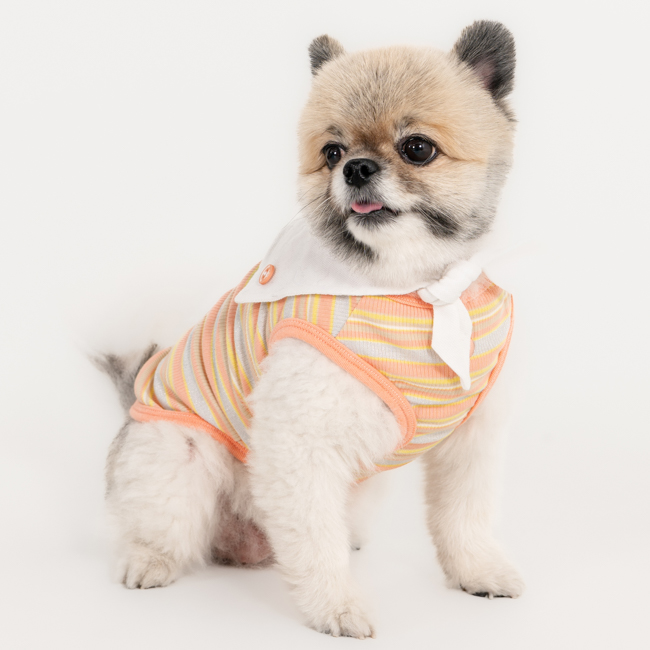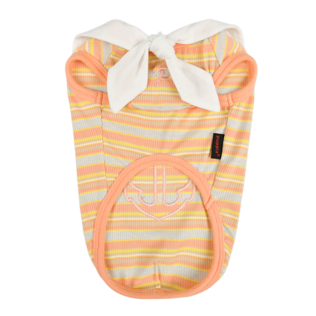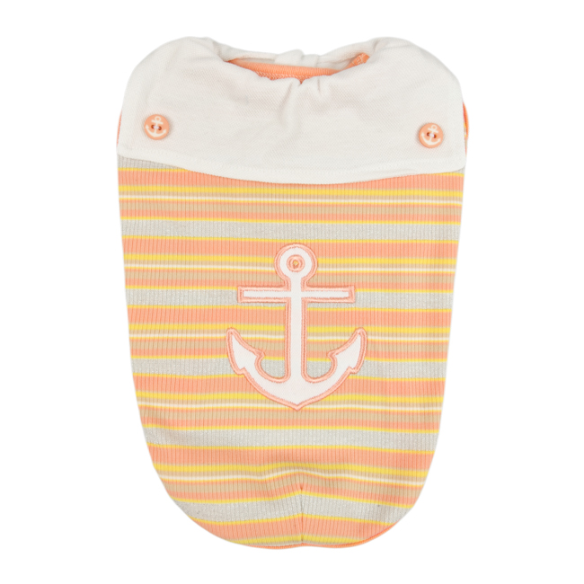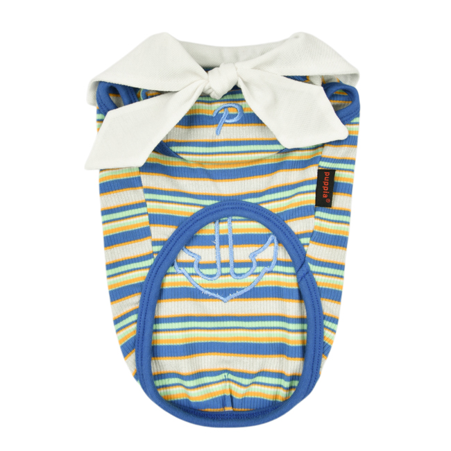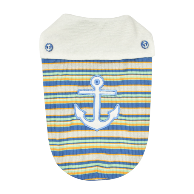 Camicia senza maniche, motivo a righe e tinta unita, decorata con applicazione ancora sul dorso
