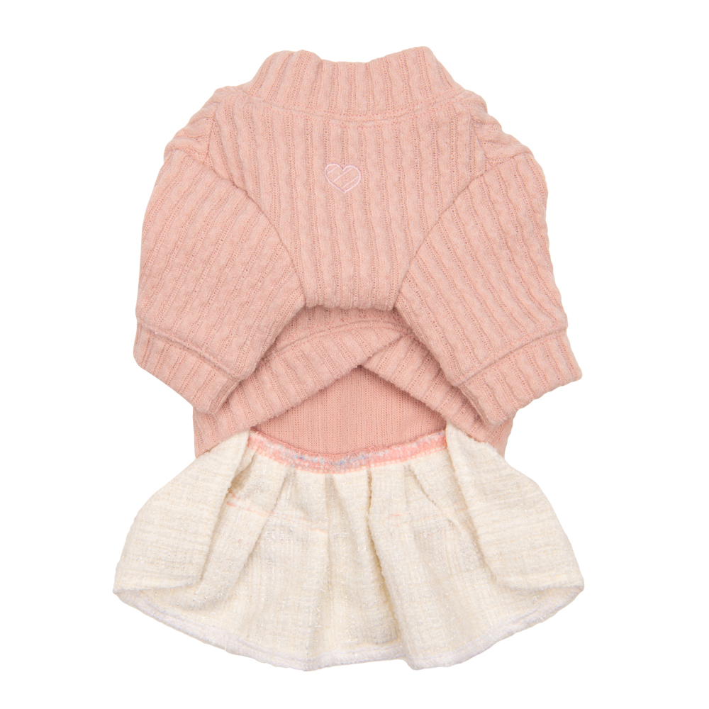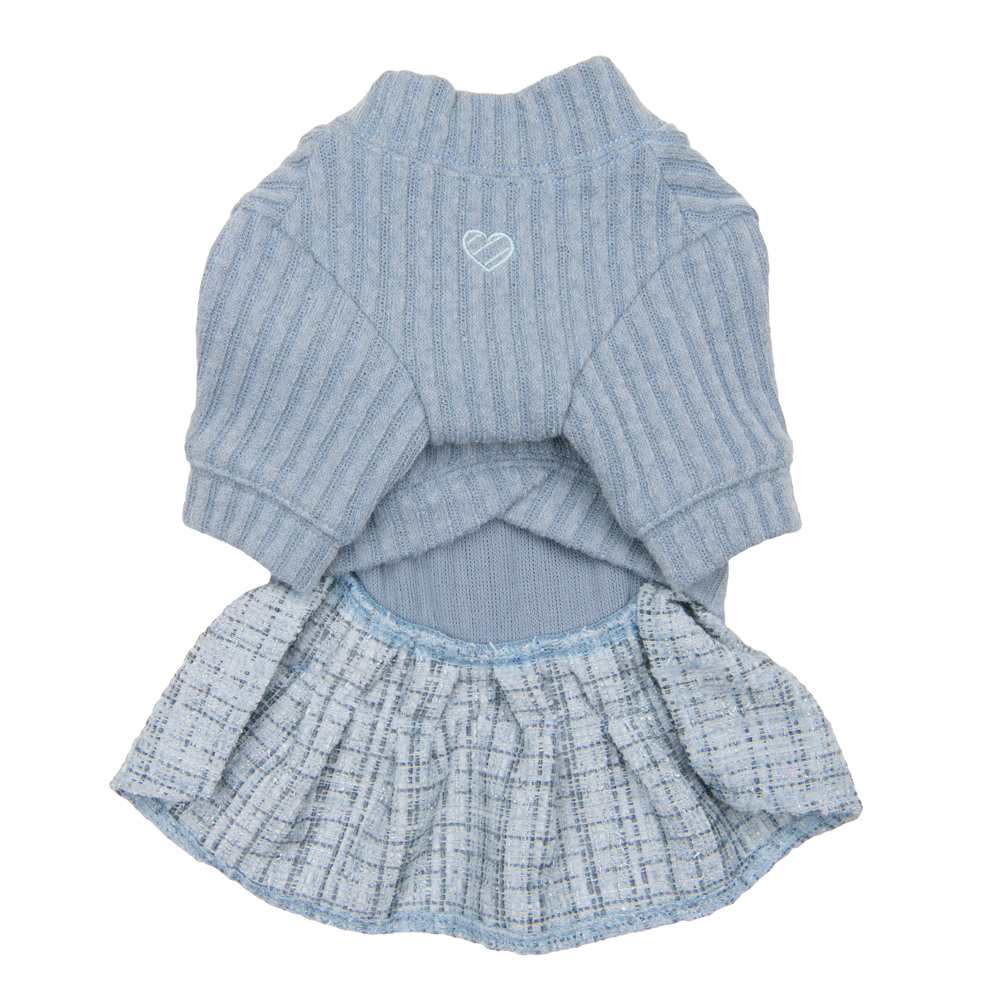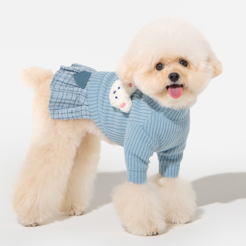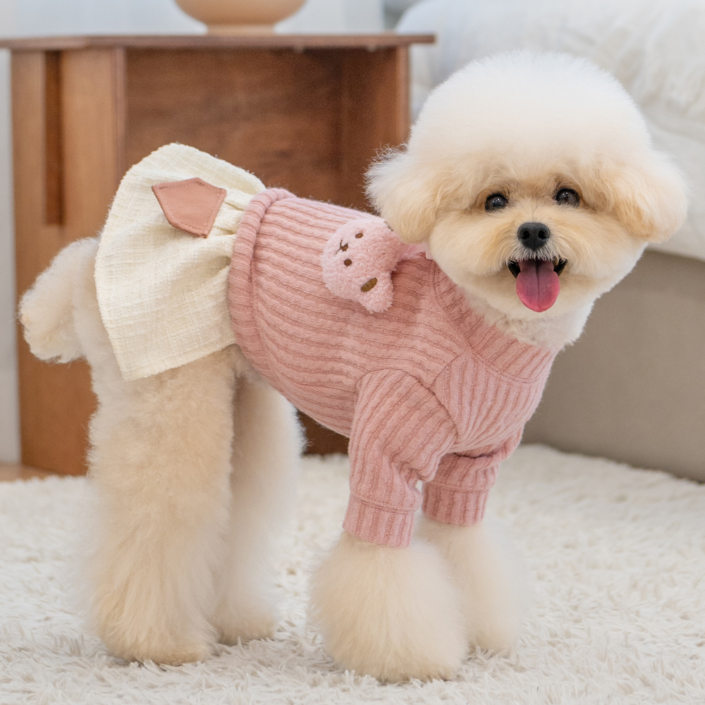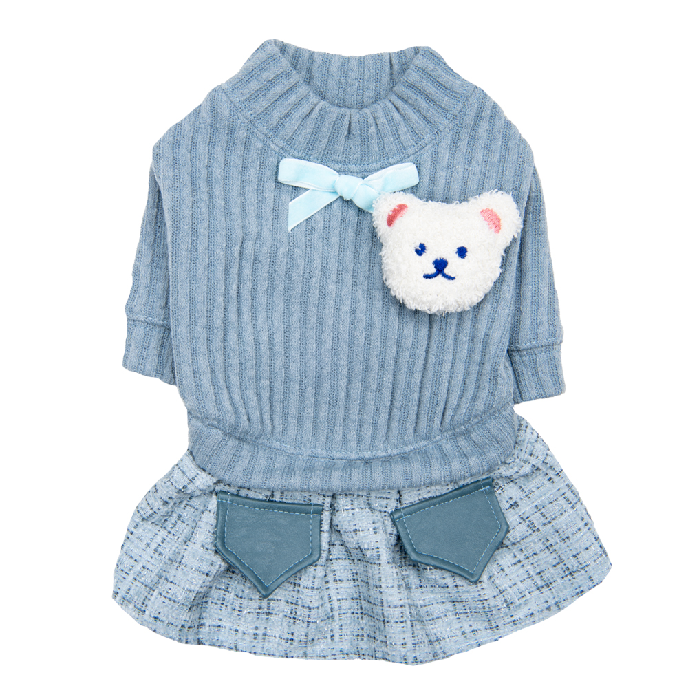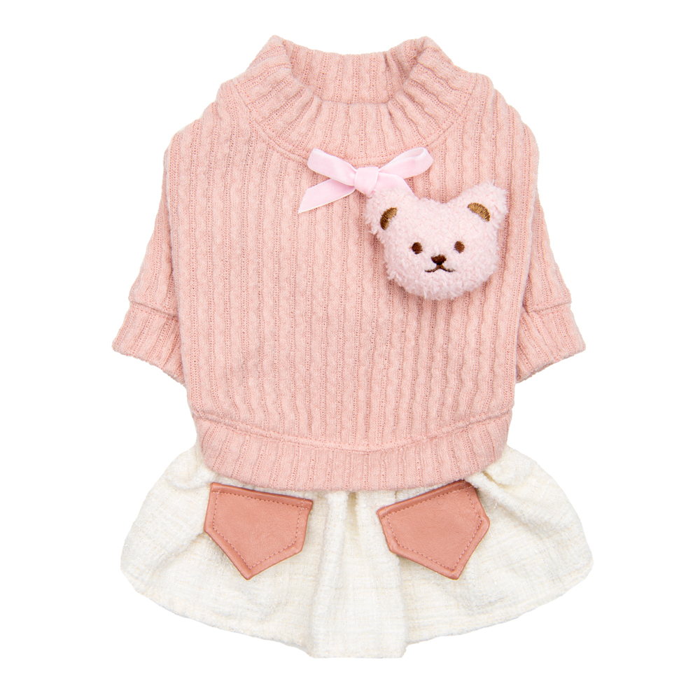 Abito intero in velluto a coste, motivo a quadri e tinta unita (gonna), decorato con orsetto di peluche e nastro sul dorso
